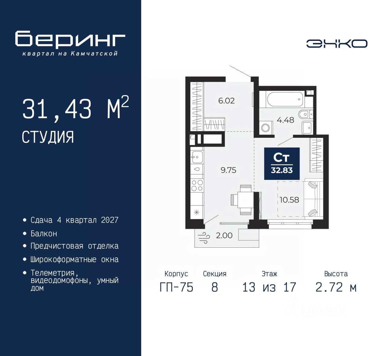 Однокомнатная квартира-студия с предчистовой отделкой в ЖК ''Беринг'' на 13 этаже. Общая площадь: 31.43 кв.м., площадь гостиной 20.33 кв.м., из которых 9.75 кв.м. выделено под кухонную зону. Все окна выходят на одну сторону. В квартире один балкон, один совмещенный санузел. Высота потолков 2.72 м.