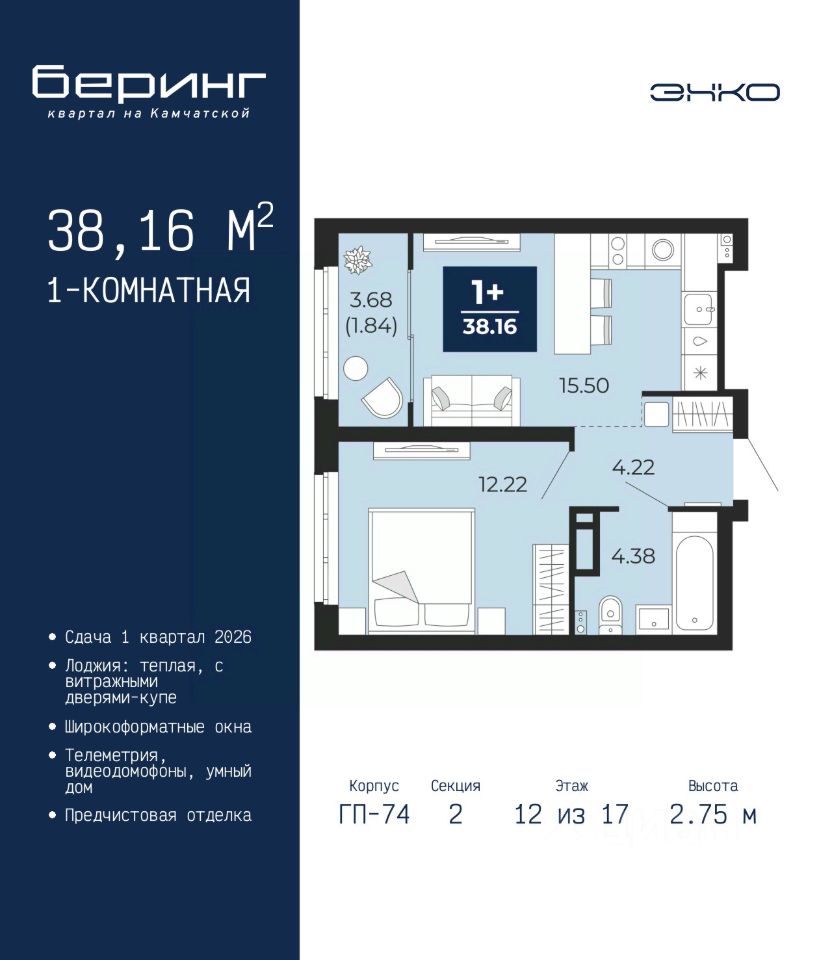 Однокомнатная квартира с предчистовой отделкой в ЖК ''Беринг'' на 12 этаже. Общая площадь: 38.16 кв.м., жилая: 12.22 кв.м., площадь просторной кухни-столовой: 15.5 кв.м. Все окна выходят на одну сторону. В квартире одна лоджия, один совмещенный санузел. Высота потолков 2.75 м.