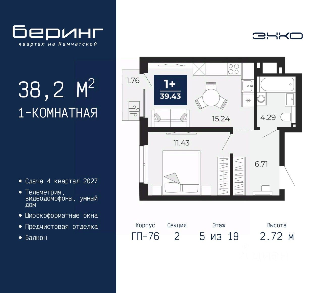 Просторная 1-комн. квартира с предчистовой отделкой в ЖК ''Беринг'' на 5 этаже. Общая площадь: 38.2 кв.м., жилая: 11.43 кв.м., площадь просторной кухни-столовой: 15.24 кв.м. Все окна выходят на одну сторону. В квартире один балкон, один совмещенный санузел. Высота потолков 2.72 м.
