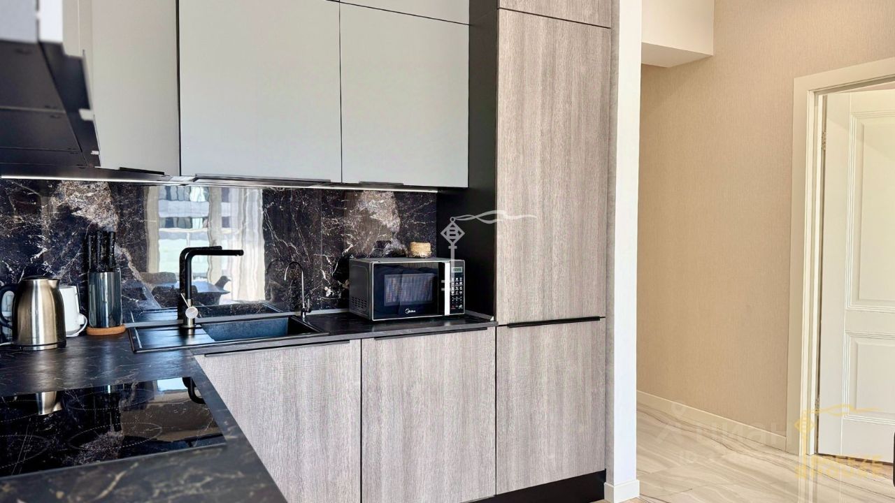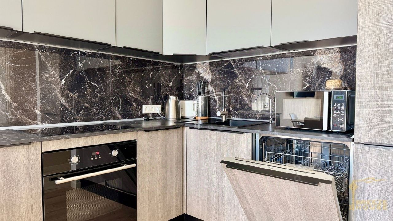 -кухня со встроенной бытовой техникой: холодильник, посудомоечная машина, духовой шкаф, микроволновая печь, индукционная варочная панель, -ванная комната оборудована необходимой сантехникой, -множество скрытых мест для хранения.