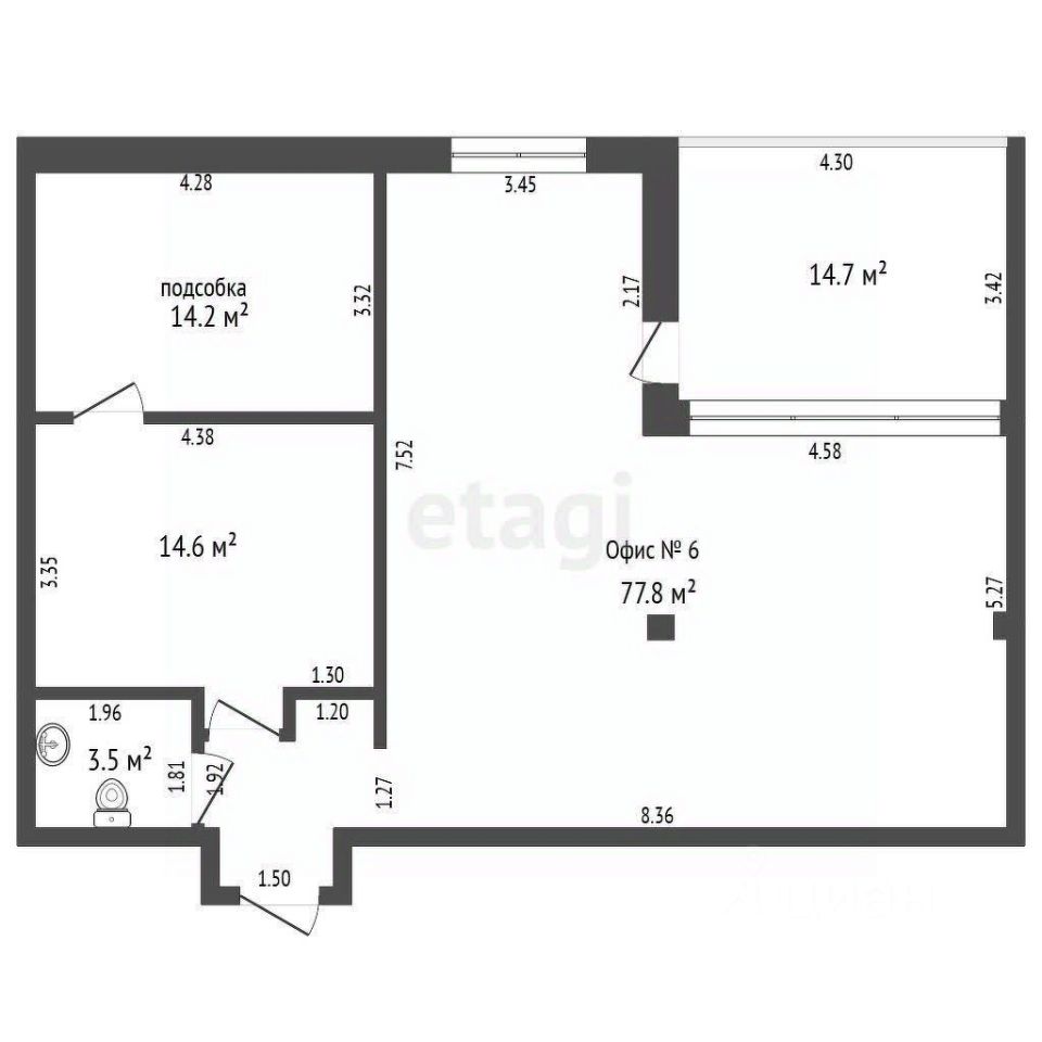 Помещение свободного назначения площадью 77,8 кв. м находится на третьем этаже здания рынка ''Универсам''. Помещение подходит для любого вида бизнеса. Расположено помещение на третьем последнем этаже. Фактическая площадь: 94м2 из них балкон 14м2 (подсобка не учтена в площади 14м2)