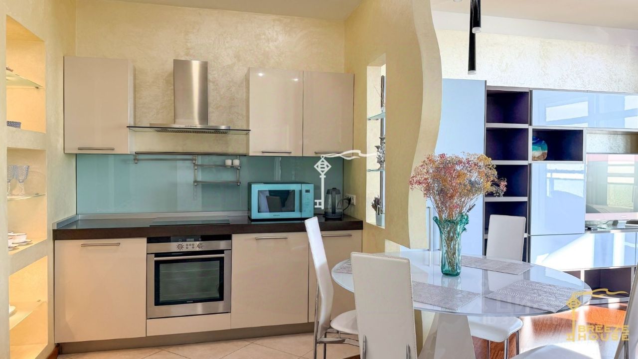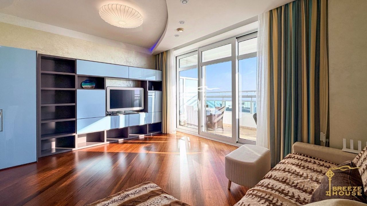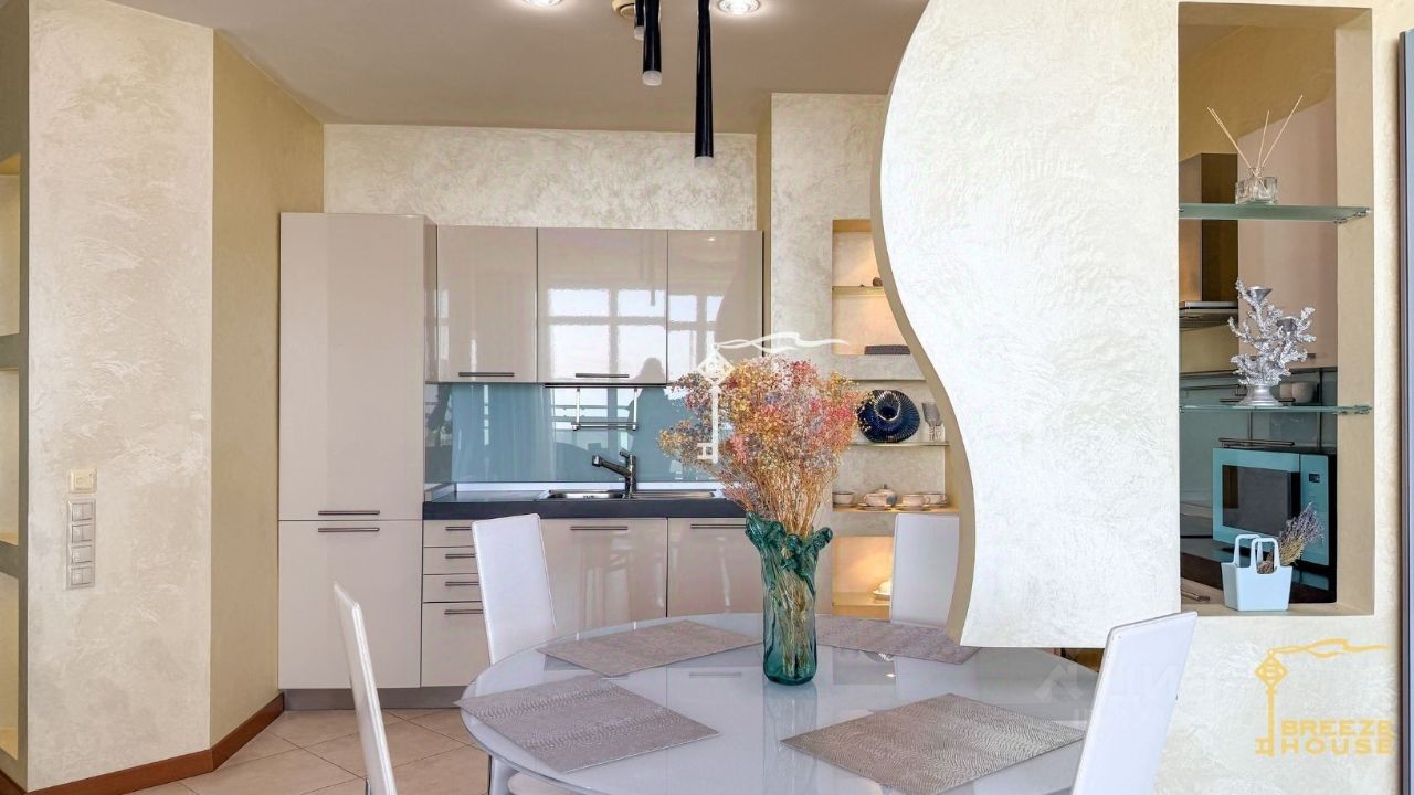 Благодаря панорамному остеклению комнаты наполнены светом, окна выходят на юг. Из квартиры открываются потрясающие виды на море и парк.