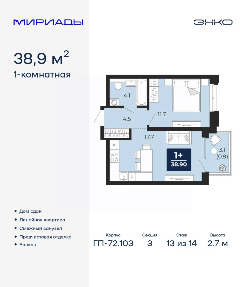Однокомнатная квартира с предчистовой отделкой в ЖК ''Мириады'' на 13 этаже. Общая площадь: 38.9 кв.м., жилая: 11.7 кв.м., площадь просторной кухни-столовой: 17.7 кв.м. Все окна выходят на одну сторону. В квартире один балкон, один совмещенный санузел. Высота потолков 2.7 м.