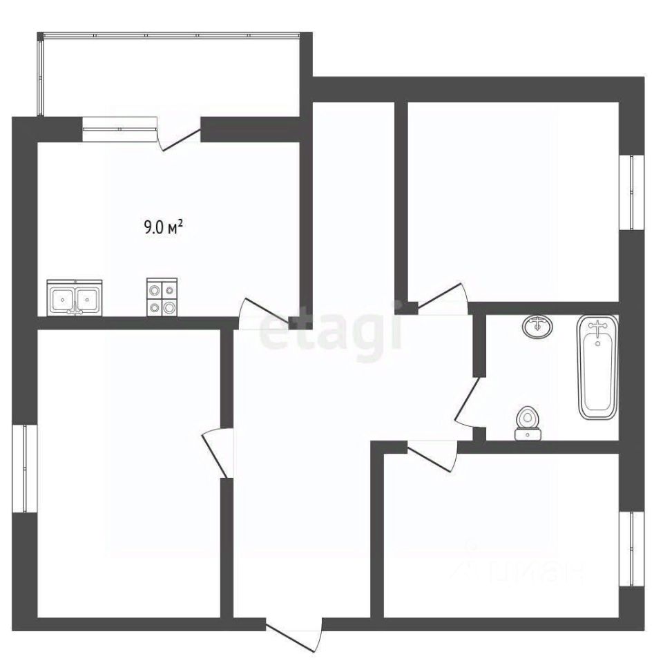 Квартира состоит из трёх спален, кухня площадью 9 м², совмещенный санузел. Центральное отопление. Окна во двор. В квартире 2 кладовки и балкон.