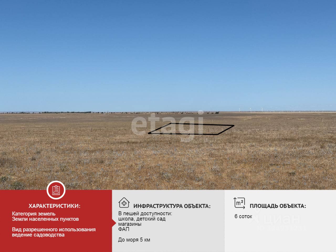 Эколoгичecки благопpиятные услoвия paсположения участка, чистый морской воздух, море не дальше 6 км.