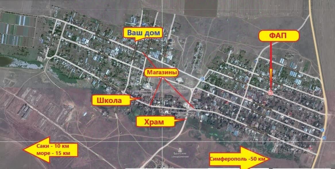 В поселке Шелковичное развита инфраструктура: до школы 600 метров , ФАП 200 метров , есть магазины , аптеки . Регулярное сообщение с городом Саки (10 км). До моря 17 км . Дом находится в тихом ,спокойном районе . ОБРАЩАЙТЕСЬ - ОРГАНИЗУЕМ ОПЕРАТИВНЫЙ ПОКАЗ! Наша комиссия 59000 р.+1% от стоимости объекта, но не менее 70000 р.