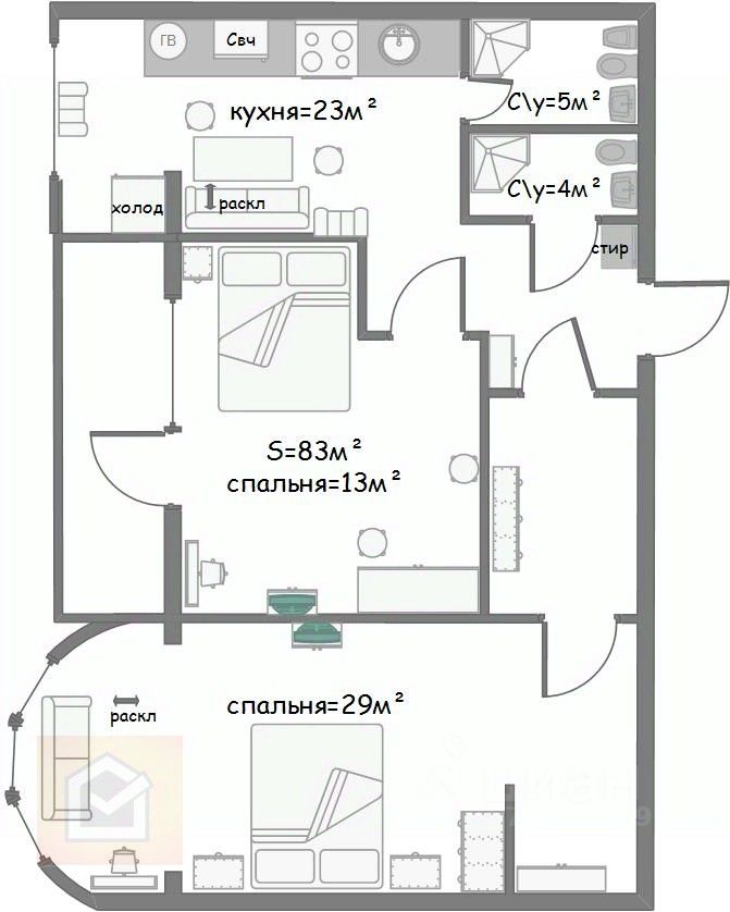 Планировка квартиры очень удобна и позволяет комфортно разместить большую семью. Просторная кухня-столовая площадью 23 м² оснащена современной мебелью и бытовой техникой, включая газовую плиту, что делает процесс приготовления пищи приятным и удобным. Также в квартире присутствует уютная спальня площадью 13 м² с балконом, а светлая комната-студия с эркером общей площадью 30 м² станет отличным местом для отдыха и развлечений. Для удобства жильцов предусмотрены два санузла с отдельными входами, укомплектованные душевыми кабинами, туалетами и биде.