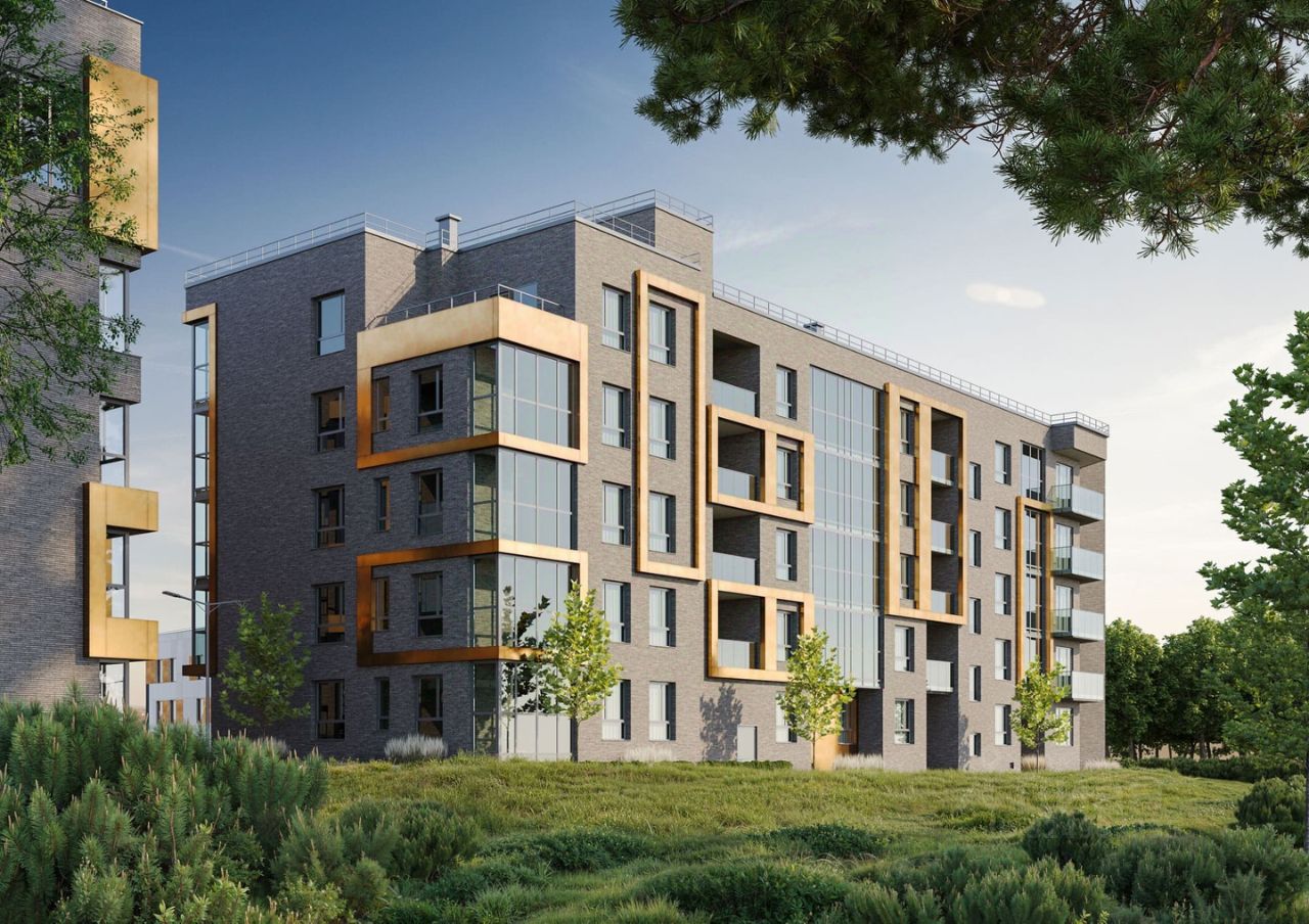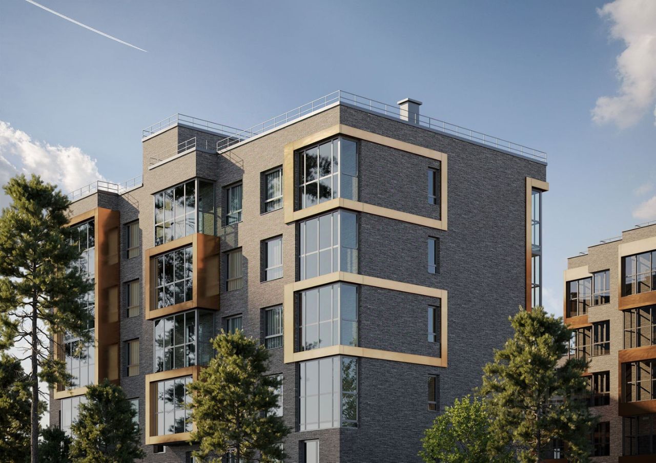 Элегантный дизайн: фасад здания отделан элитными материалами, такими как клинкерная плитка и медные панели, выдерживающие испытание временем.