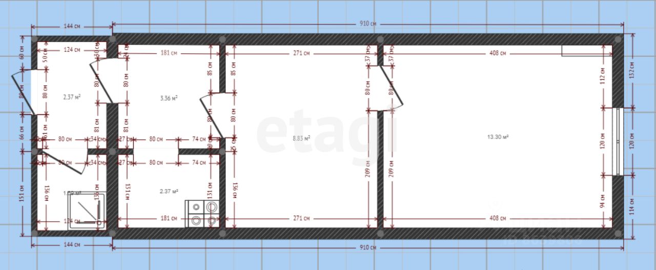 Квартира ''на земле'' площадью 28 кв.м. состоит из двух жилых комнат, кухни, прихожей и оборудована душевая. Уборная во дворе, можно оборудовать рядом с душевой в квартире.