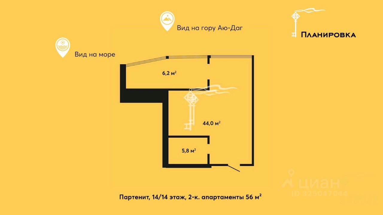 Продаются апартаменты площадью 56 м² под отделку с просторной террасой и видом на море и гору Аю-Даг в Партените.