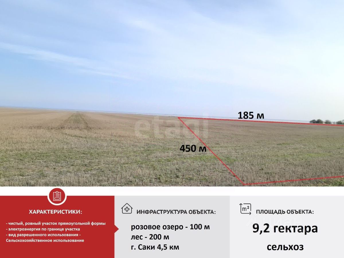 Продается участок 9,2 гектара сельхоз назначения - Участок ровной, прямоугольной формы, находится в живописном месте с красивыми видами С одной стороны соленое розовое озеро с другой стороны лес и небольшой пруд - линия электропередач проходит по границе участка - Вoдa доступнa из cквaжины - Удобное расположение - до трассы 1,4 км - до г. Саки 4,5 км - Участок ухоженный, плодородная земля - Рядом расположен смежный участок площадью 6,5 гектара, возможна покупка обоих участков вместе.