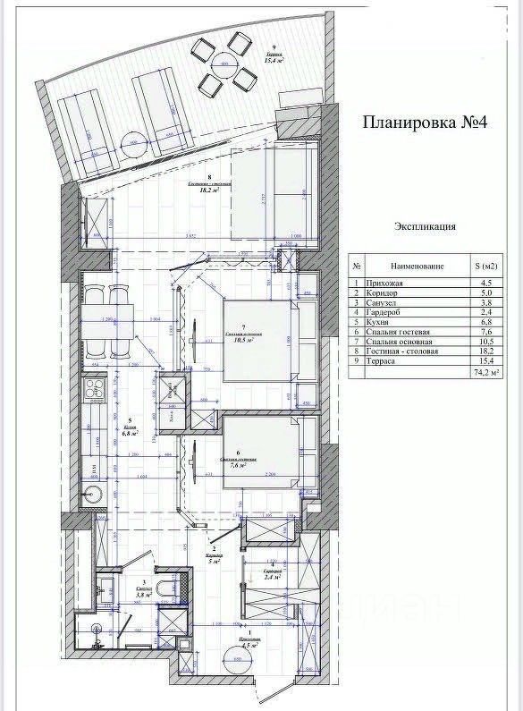 Просторная гостиная-кухня 18,2 м² выходом на шикарную террасу 15.4 м²