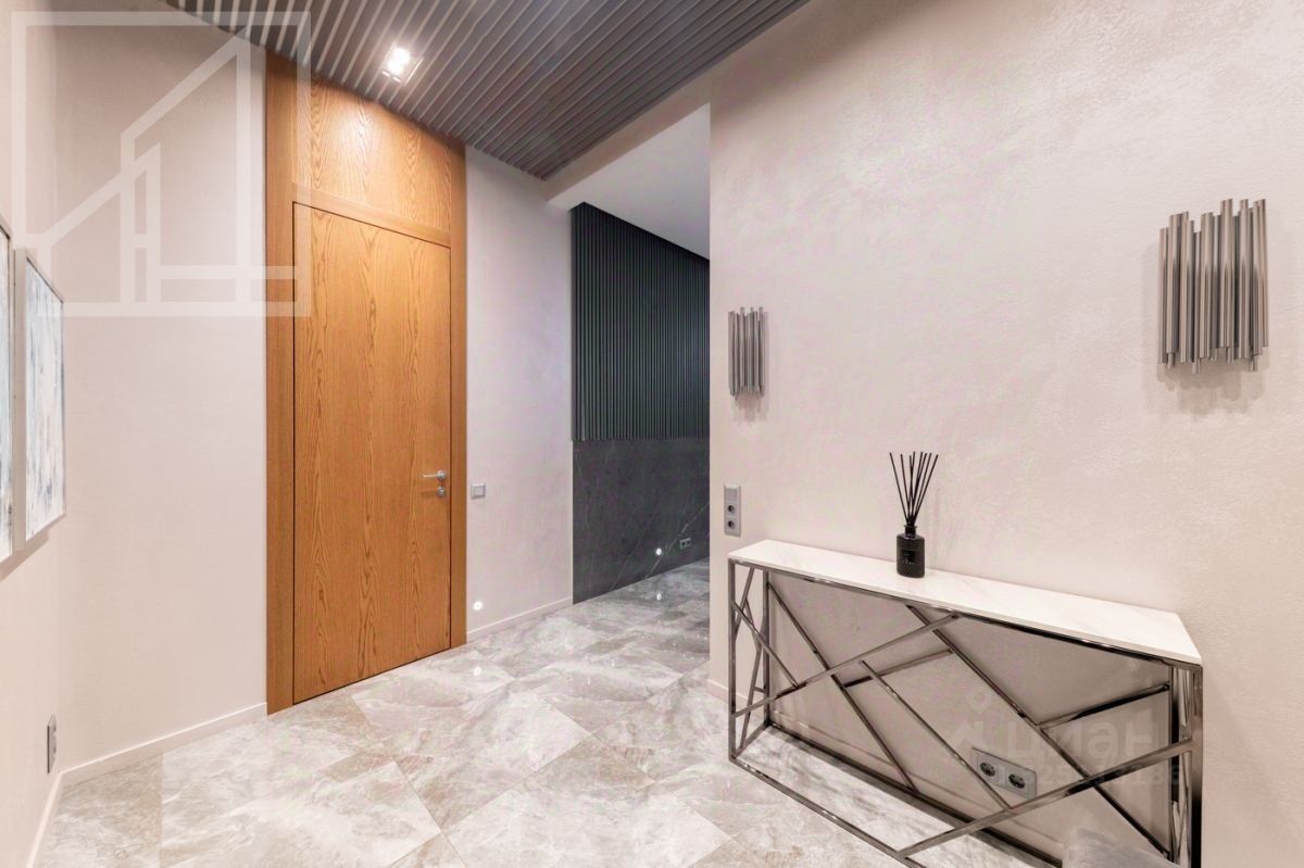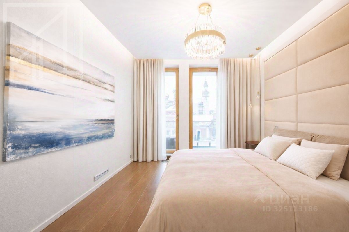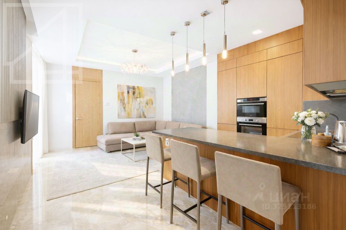 Планировка: кухня-гостиная, 2 спальни, 2 ванные комнаты, 2 гардеробные, холл. Апартамент полностью укомплектован современной мебелью, кухня оснащена встроенной техникой премиум-класса. Выполнена премиальная дизайнерская отделка с использованием натурального дерева и крупного керамогранита. Светлый интерьер оформлен в современном стиле, украшен картинами и авторскими светильниками. Установлена система кондиционирования. Из окон открывается живописный вид на Никольскую церковь.