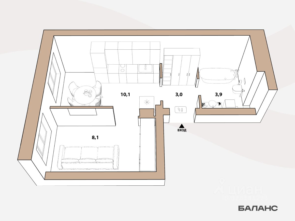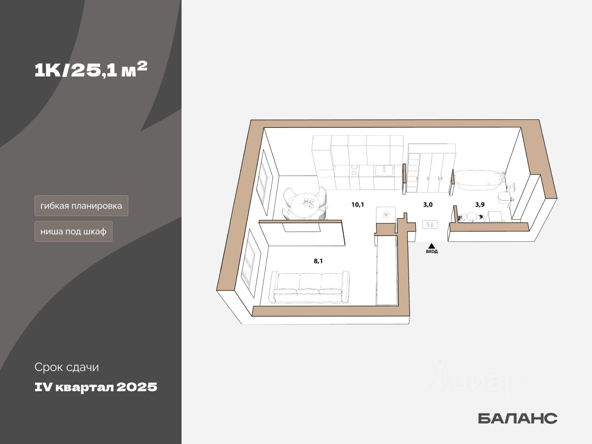 Однокомнатная квартира без лишних метров — хороший вариант для первой покупки. В прихожей продумана ниша под шкаф-купе. Планировка гибкая: кухню можно объединить со спальней, чтобы создать больше пространства.
