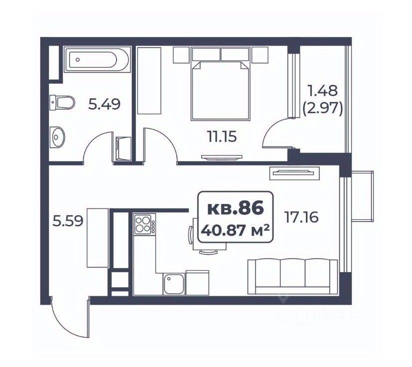 В строящемся ЖК продается 1-но комнатная квартира, которая состоит из спальни 11,15 кв.м., кухни-гостиной 17,16 кв. м., санузла 5,49 кв.м., прихожей 5,59 кв.м. и балкона 1,48 кв. м. Общая площадь квартиры 40,87 кв.м. Расположена на 5 этаже 8-ми этажного дома. ВИД НА МОРЕ! До песчаного пляжа 1 км.