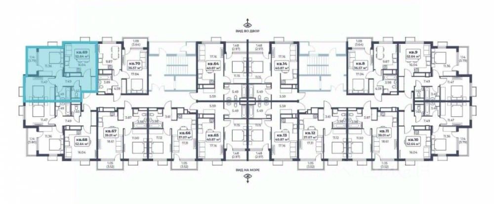 В строящемся ЖК продается 2-х комнатная квартира, которая состоит из кухни-гостиной 16,04 кв.м., двух комнат 11,36 и 11,47 кв.м., ванны 3,49 кв. м., санузла 1,65 кв.м., прихожей 7,49 кв.м. и балкона. Общая площадь квартиры 52,64 кв.м. Расположена на 2 этаже 8-ми этажного дома. До песчаного пляжа 1 км.