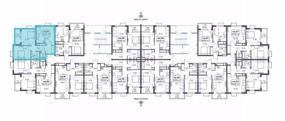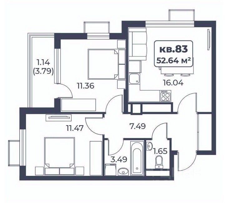 В строящемся ЖК продается 2-х комнатная квартира, которая состоит из кухни-гостиной 16,04 кв.м., двух комнат 11,36 и 11,47 кв.м., ванны 3,49 кв. м., санузла 1,65 кв.м., прихожей 7,49 кв.м. и балкона. Общая площадь квартиры 52,64 кв.м. Расположена на 4 этаже 8-ми этажного дома. До песчаного пляжа 1 км.