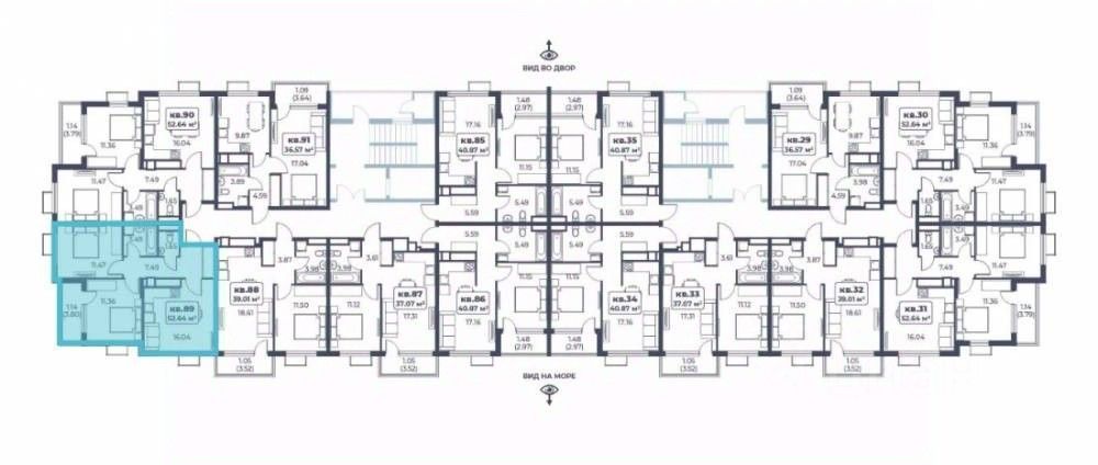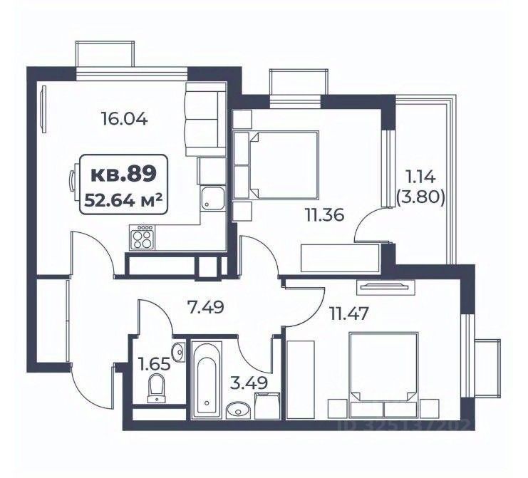 В строящемся ЖК продается 2-х комнатная квартира, которая состоит из кухни-гостиной 16,04 кв.м., двух комнат 11,36 и 11,47 кв.м., ванны 3,49 кв. м., санузла 1,65 кв.м., прихожей 7,49 кв.м. и балкона. Общая площадь квартиры 52,64 кв.м. Расположена на 5 этаже 8-ми этажного дома. До песчаного пляжа 1 км.