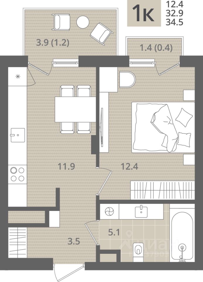 Общая площадь34,5 м2