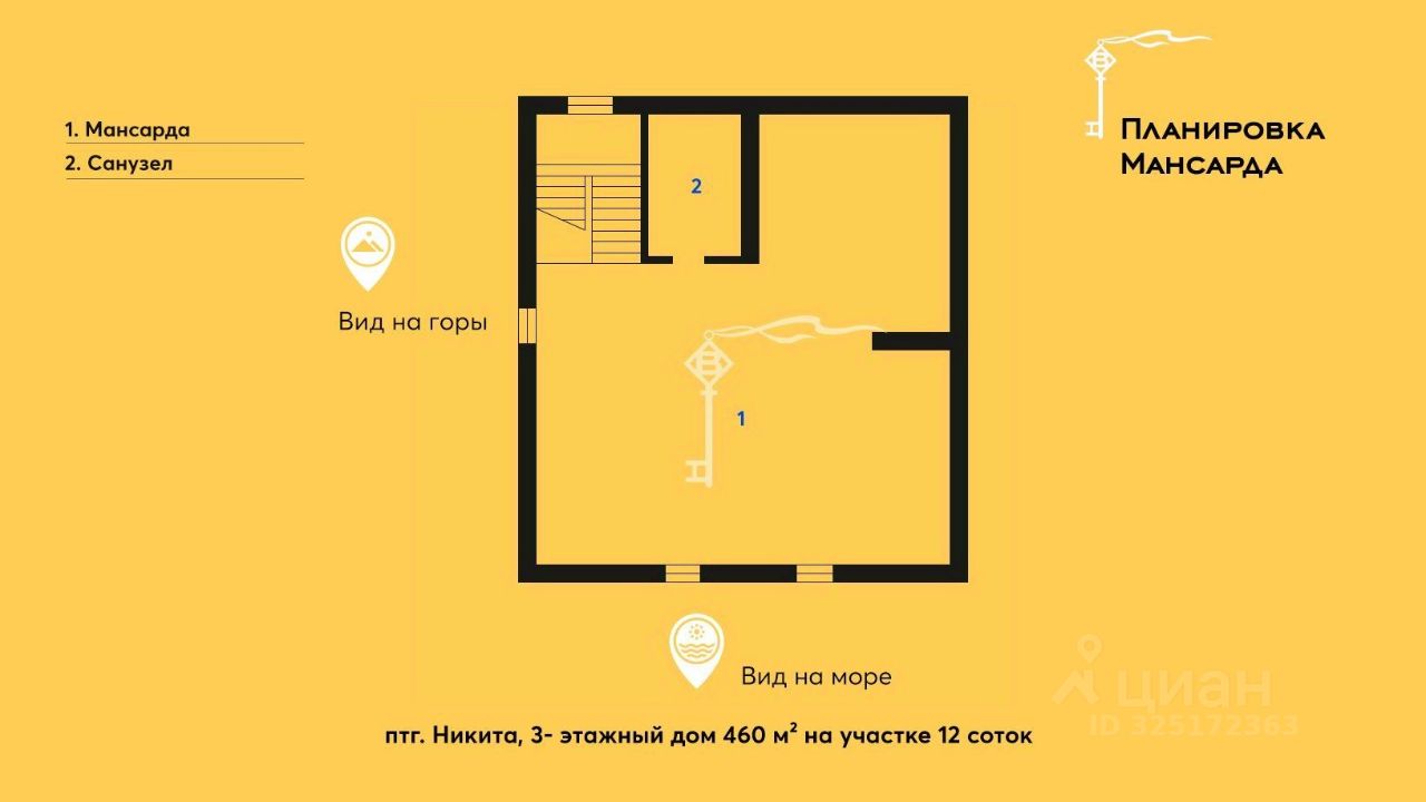 -две спальни с эффектным видом на море, -кабинет, -санузел, -выход на террасу.