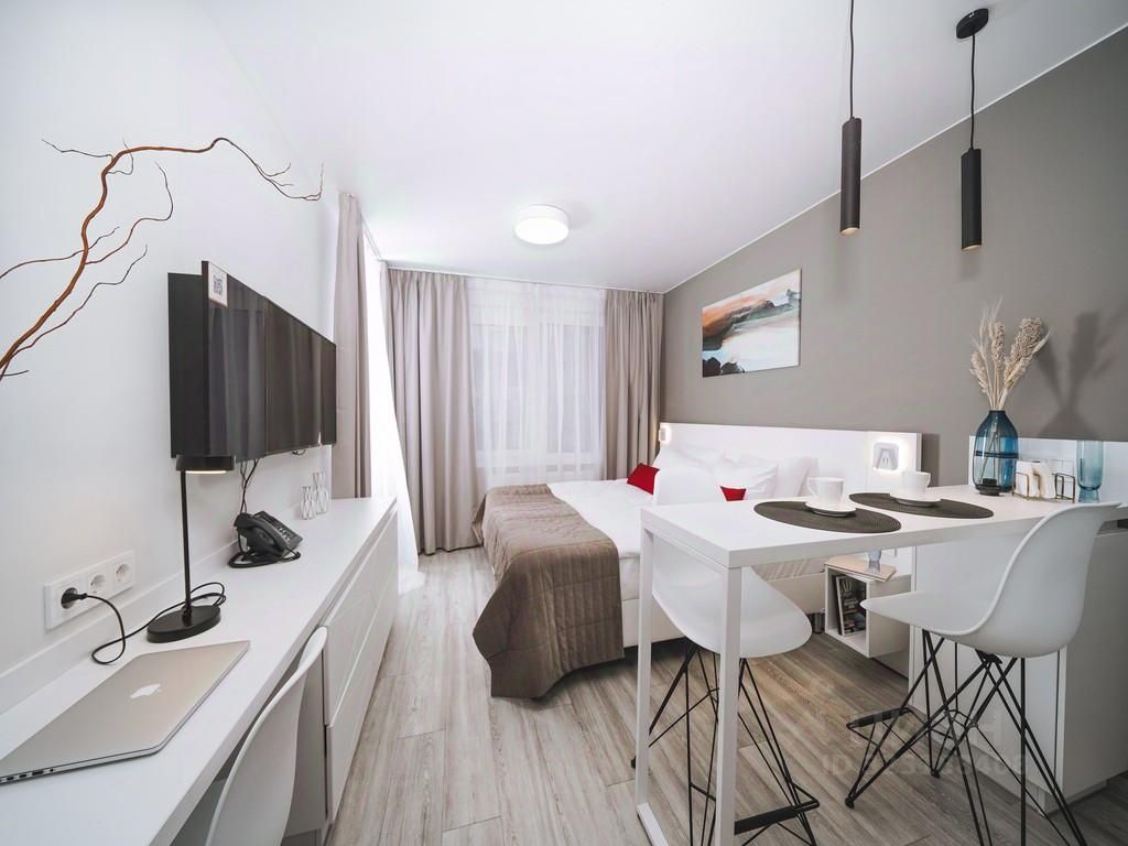 - На кухне есть кухонный гарнитур, холодильник, плита для приготовления пищи, микроволновая печь, чайник, кухонная посуда и аксессуары, столовые приборы - В зоне релакса есть кабельное телевидение, интернет, кондиционер, электронные замки, фен, зеркало, вешалки, шкаф для одежды, сейф. - В ванной комнате установлена сантехника высокого европейского качества и полноценная ванна. Также в номере есть стиральная машина, сушилка для белья, утюг и гладильная доска. - На территории комплекса есть вся необходимая инфраструктура: магазины, аптека, фитнес-зал, салон красоты, барбершоп, кондитерская, несколько ресторанов, пиццерия, сервисы доставки еды. - Собственный 25-метровый бассейн с 4 дорожками!