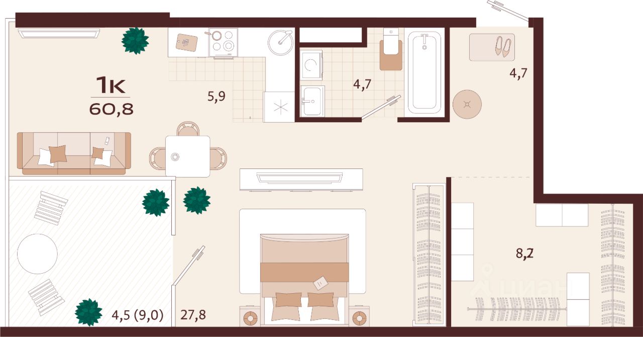 Продаётся 1-комнатная квартира в строящемся доме (Корпус 1), срок сдачи: II-кв. 2027, общей площадью 60.8 кв.м., на 2 этаже. Жилой комплекс бизнес-класса ''РОЯЛТА'' от застройщика ''ГК ТОЧНО'' в городе Ялта Республики Крым на улице Спендиарова.