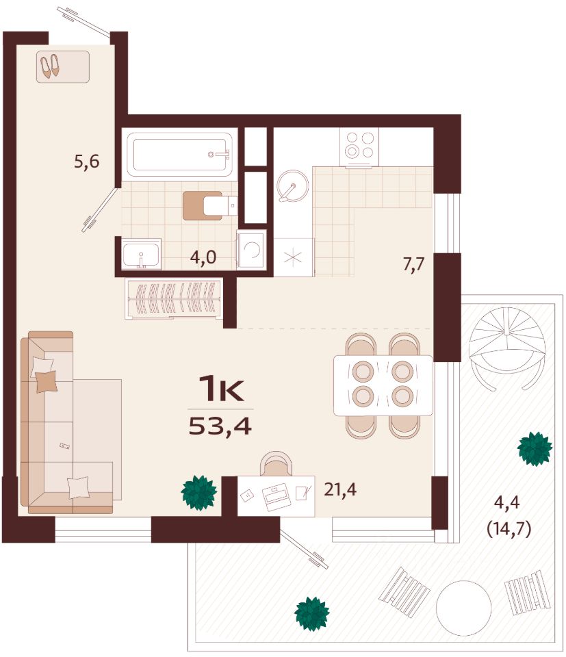 Общая площадь53,4 м2