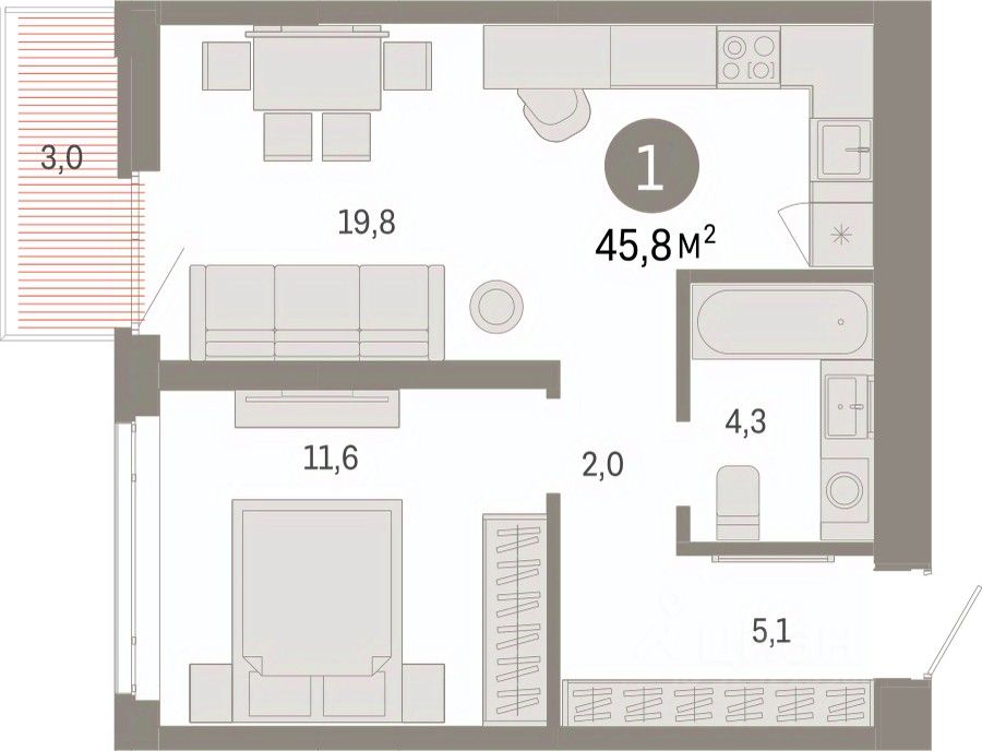 Просторная 1-комн. квартира с предчистовой отделкой в ЖК ''Республики 205'' на 8 этаже. Общая площадь: 45.82 кв.м. Высота потолков 2.7 м.