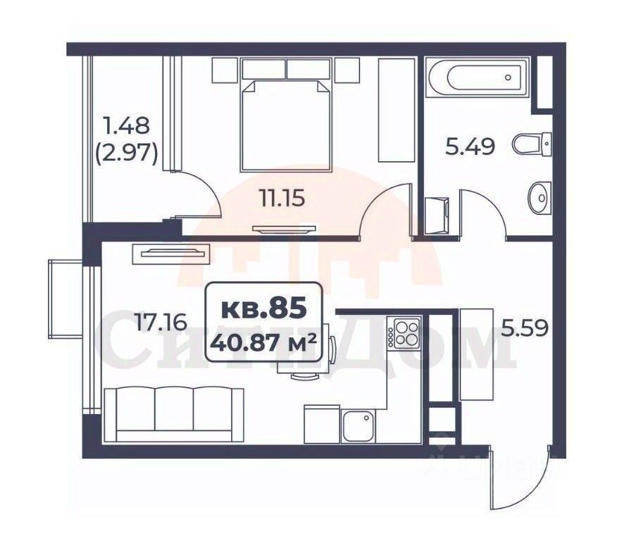 В строящемся ЖК продается 1-но комнатная квартира, которая состоит из спальни 11,15 кв.м., кухни-гостиной 17,16 кв. м., санузла 5,49 кв.м., прихожей 5,59 кв.м. и балкона 1,48 кв. м. Общая площадь квартиры 40,87 кв.м. Расположена на 5 этаже 8-ми этажного дома. До песчаного пляжа 1 км.