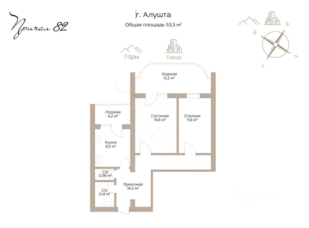 Квартира расположена на 12-м этаже 13-этажного жилого дома. Общая площадь согласно выписке ЕГРН 53,3 кв.м. (без учета лоджий). Планировка включает: зону прихожей 14,3 кв.м., кухню 8,5 кв.м., гостиную 14,8 кв.м., спальню 11,6 кв.м., раздельный сан.узел 4,1 кв.м., две лоджии 13,8 и 4,2 кв.м. (не входят в общую площадь). Из окон открывается панорамный вид на горы.