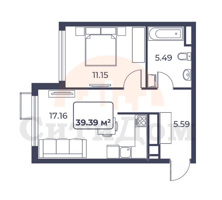 В строящемся ЖК продается 1-но комнатная квартира, которая состоит из спальни 11,15 кв.м., кухни-гостиной 17,16 кв. м., санузла 5,49 кв.м., прихожей 5,59 кв.м. Общая площадь квартиры 39,39 кв.м. Расположена на 1 этаже 8-ми этажного дома. До песчаного пляжа 1 км.
