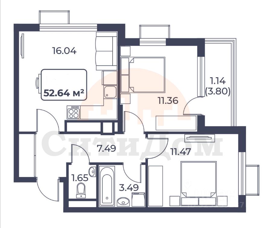 В строящемся ЖК продается 2-х комнатная квартира, которая состоит из кухни-гостиной 16,04 кв.м., двух комнат 11,36 и 11,47 кв.м., ванны 3,49 кв. м., санузла 1,65 кв.м., прихожей 7,49 кв.м. и балкона. Общая площадь квартиры 52,64 кв.м. Расположена на 2 этаже 8-ми этажного дома. До песчаного пляжа 1 км.