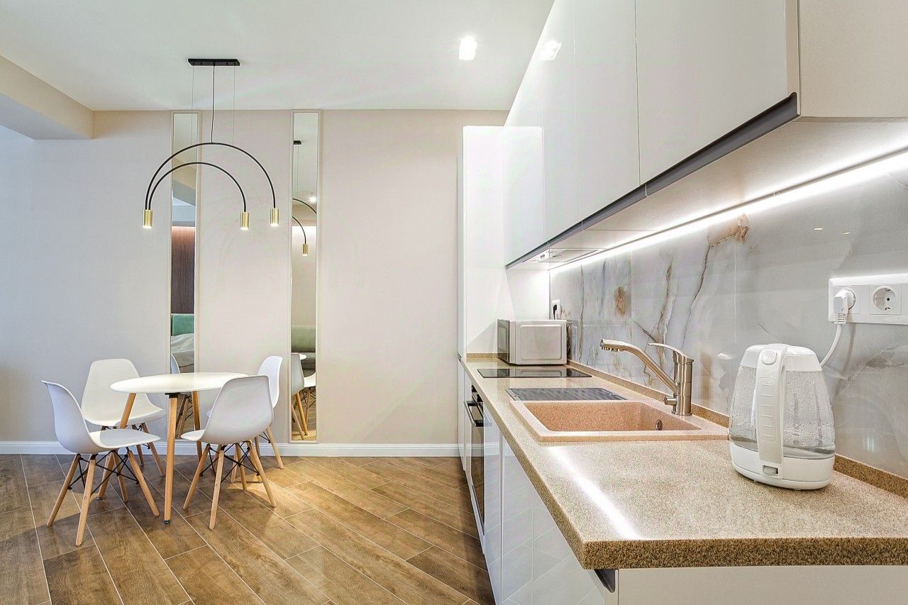 Мебель: каждое помещение оснащено стильной мебелью вы можете заехать и сразу наслаждаться комфортом. Модная цветовая гамма: интерьер выполнен в изысканных оттенках пудрово-розового и светло-зеленого, создавая атмосферу уюта и гармонии. Кухня: полностью укомплектована всей необходимой техникой: холодильник, вытяжка, плита, духовой шкаф, посудомоечная машина. Дизайн санузла: элегантное пространство с акцентными черными аксессуарами и дизайнерской раковиной, которые придают особый шик и современность. Освещение под любое настроение: различные сценарии освещения позволяют создавать идеальную атмосферу от мягкого приглушенного света для отдыха до яркого рабочего освещения.