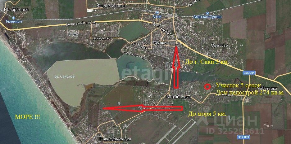Участок расположен в тихом и спокойном месте, граничит с селом Михайловка в Сакском районе. Всего в 200 метрах находится озеро, что делает это место идеальным для отдыха и рыбалки. Удобное расположение позволит вам добраться до города Саки всего за 10-15 минут, а до моря — всего 7 км, что займет не более 10 минут на автомобиле.