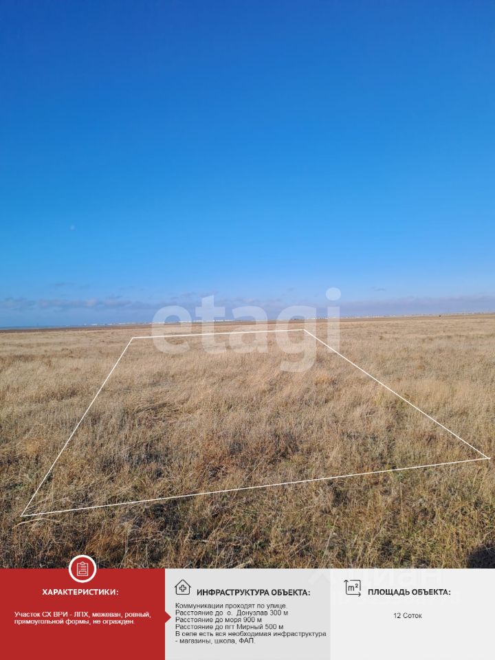 Продaется земeльный участок в 300 метрах от о. Донузлав, 900 метрах от Черного моря в пгт Мирный. Общая площадь земельного участка 12 соток.