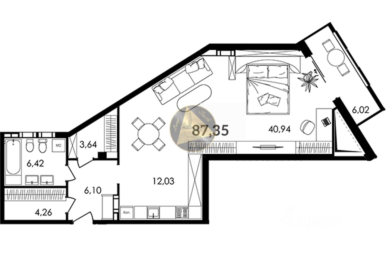 О квартире: - Квартира находится на 5 этаже 12-этажного дома - Общая площадь квартиры 87.35 м2 - Жилая комната 40.94 м2 - Зона кухни 12.03 м2 - Совмещённый санузел 6.42 м2 - Гардеробные 3.64 и 4.26 м2 - Терраса 6.02 м2