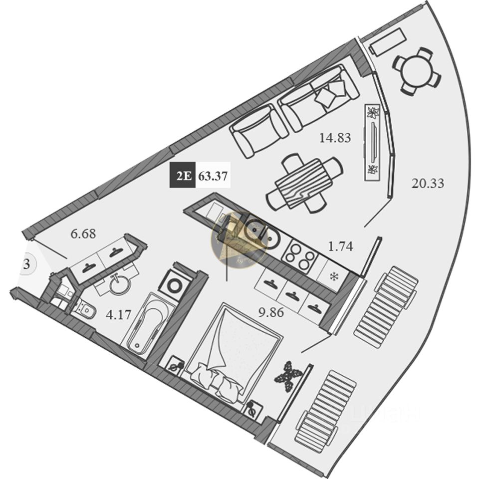 О квартире: - Квартира находится на 6 этаже 20-этажного дома - Общая площадь квартиры 63.37 м2 - Светлая спальня 9.86 м2 - Просторная кухня-гостиная 16.57 м2 - Совмещённый санузел 4.17 м2 - Балкон 20.33 м2