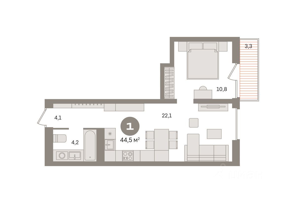 Квартира с кухней-гостиной и одной спальней в Северном квартале. Особенности планировки: балкон, предчистовая отделка. квартиры в нашей базе: СКВ04.2-Ж1.5.2.