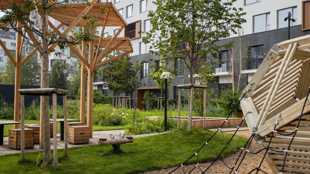 Проект благоустройства связывает приватные дворы кварталов, парковое пространство вокруг урбан-вилл, игровые комплексы для детей разных возрастов и спортивные площадки в единый ландшафт. Внутриквартальный двор тихий и спокойный. За счёт разной этажности и арок во дворе — много света. Здесь будет высажено до 40 видов растений — деревья, кустарники, цветы, злаковые травы и газон. Деревья привезут уже взрослыми со сформированной кроной. Растения цветут в разное время года, имеют разную плотность и высоту. Всё это сделано для того, чтобы двор был разнообразным и в каждое время года имел свой цвет. #2mztEf