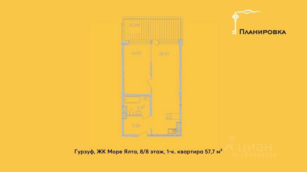 Общая площадь апартаментов составляет 57,7 м², включая просторную террасу площадью 12,8 м².