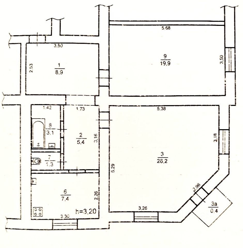 Квартира состоит из двух больших комнат правильной формы 26,2 кв.м. + 19,9 кв.м., кухни 7,4 кв.м., прихожей 8,9 кв.м., санузел раздельный.