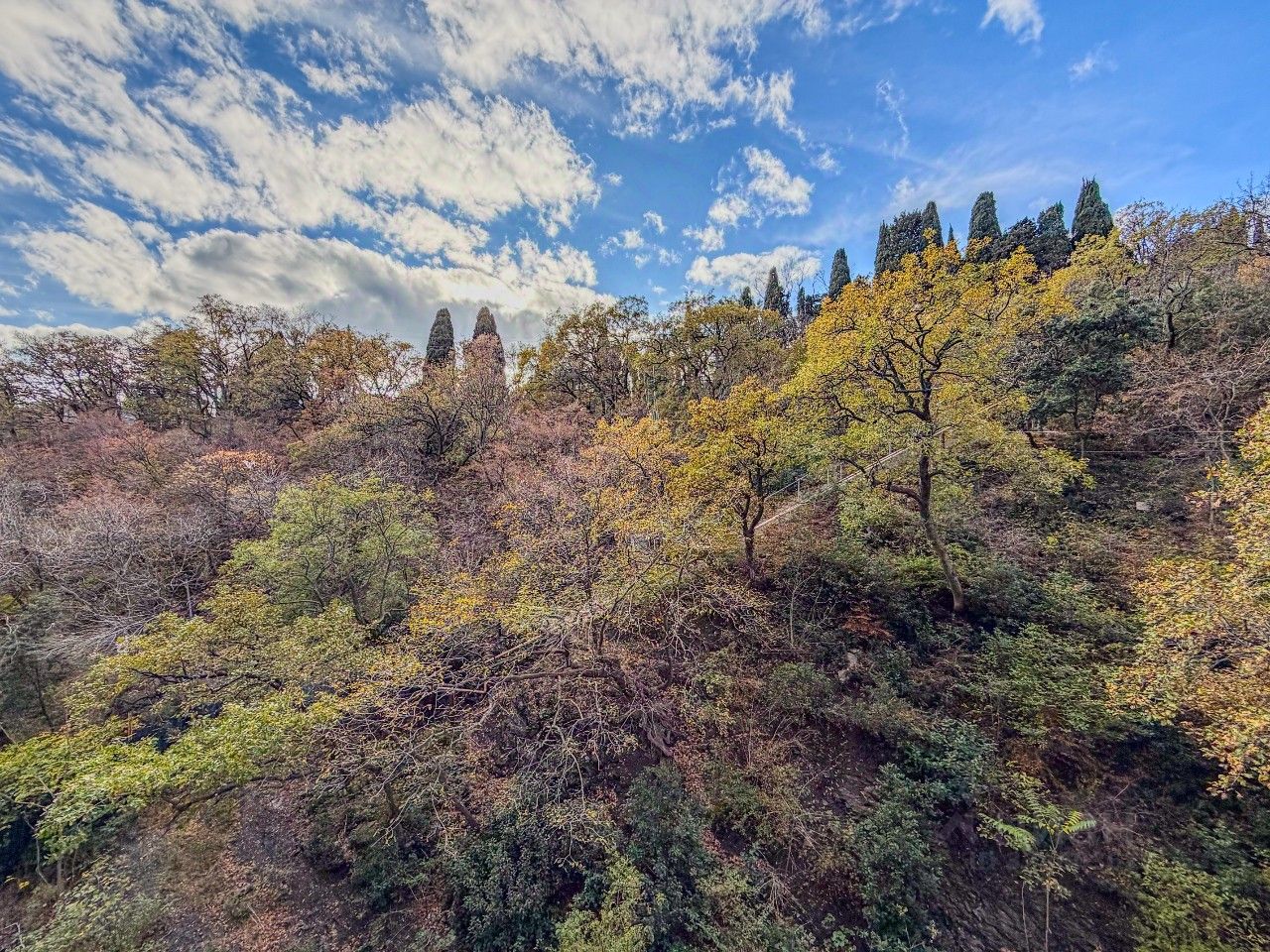 Вид на горы и зелёные аллеи парка