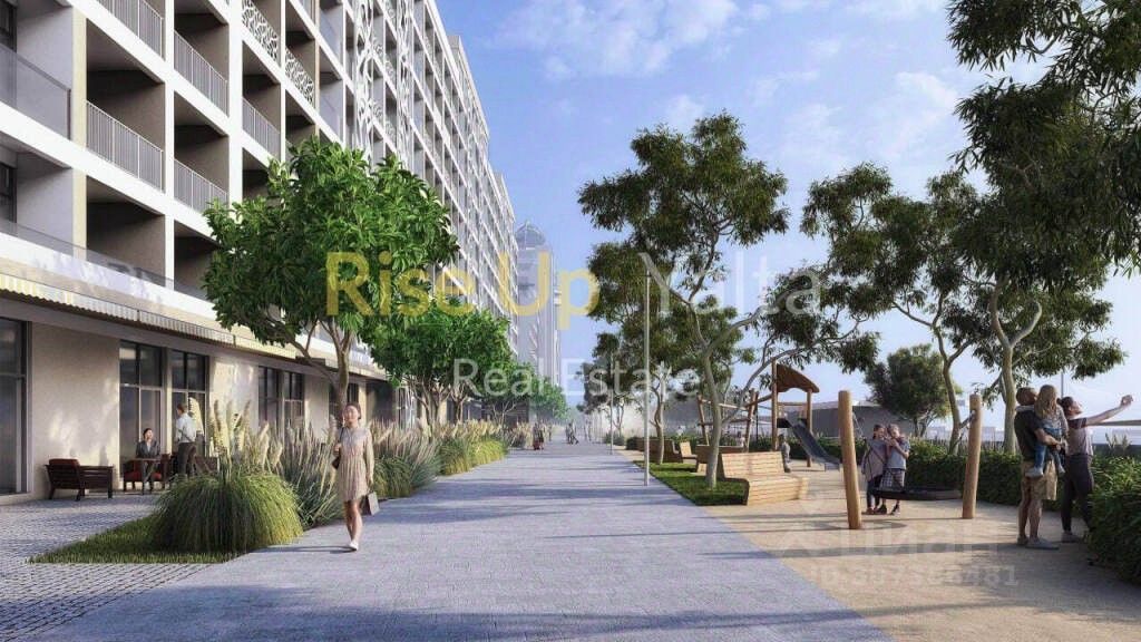 Прилегающая территория отделена от зоны пляжа зелеными зонами отдыха, вело и пешеходной дорожкой, что позволит в любое удобное для Вас время заниматься спортом или неспешно прогуливаться вдоль берега, наслаждаясь целебным морским воздухом.