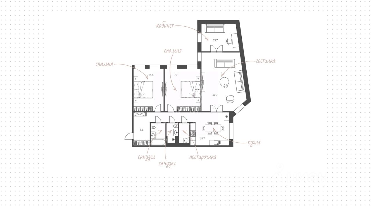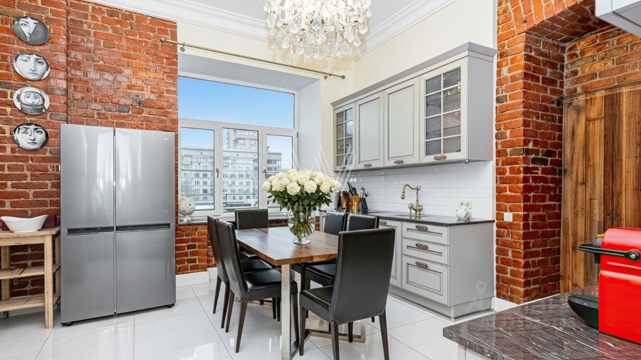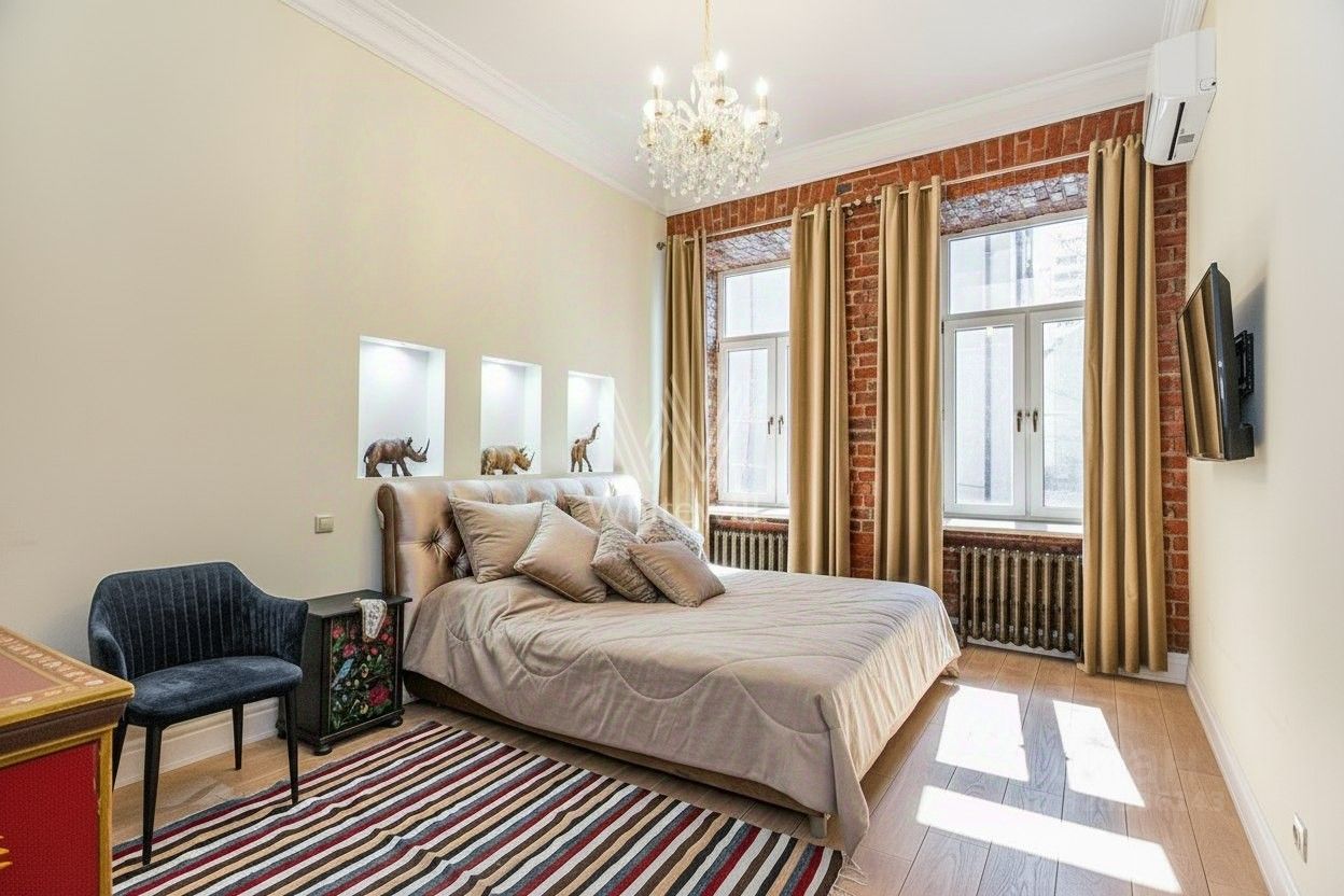 Планировка: гостиная, кабинет, кухня-столовая, 2 спальни, в каждой из которых встроенный шкаф, 2 с/у, постирочная (стиральная и сушильная машины). Квартира полностью меблирована и укомплектована бытовой техникой от мировых производителей. Кухня итальянской фабрики Stosa привезена из Италии (по индивидуальному заказу). На полу: доска из массива дуба, керамогранит. Подоконники - мрамор и гранит, столешница на кухне гранит. Двери под заказ (2,80м). Батареи немецкие чугунные в ретро стиле. Кондиционеры в каждой комнате, бойлер, теплые полы, Потолки 3,60м.