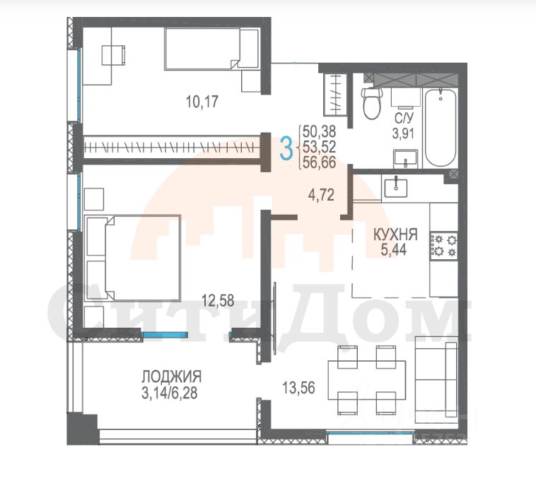 В строящемся ЖК ''Розовое озеро'' продается отличная квартира, которая состоит из кухни-гостиной 19,0 кв.м, двух комнат 10,17 и 12,58 кв.м., совмещенного санузла 3,91 кв.м., прихожей 4,72 кв.м.ю и лоджии 6,28 кв.м.. Общая площадь 56,66 кв.м. Квартира сдается без отделки. Квартира расположена на 4 этаже.