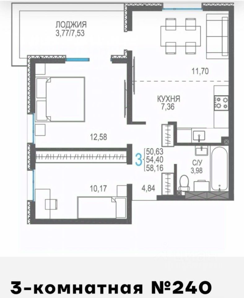 Общая площадь58,16 м2