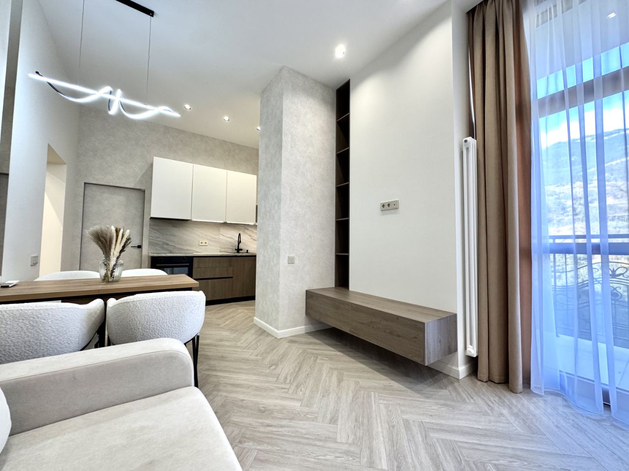 О квартире: • продуманная планировка — 2 комнаты, кухня-гостиная • гардеробная • два санузла • просторный видовой балкон с панорамами моря, гор и зелёного массива • дизайнерская отделка в спокойных тонах • полностью укомплектована мебелью и техникой — можно заезжать и жить