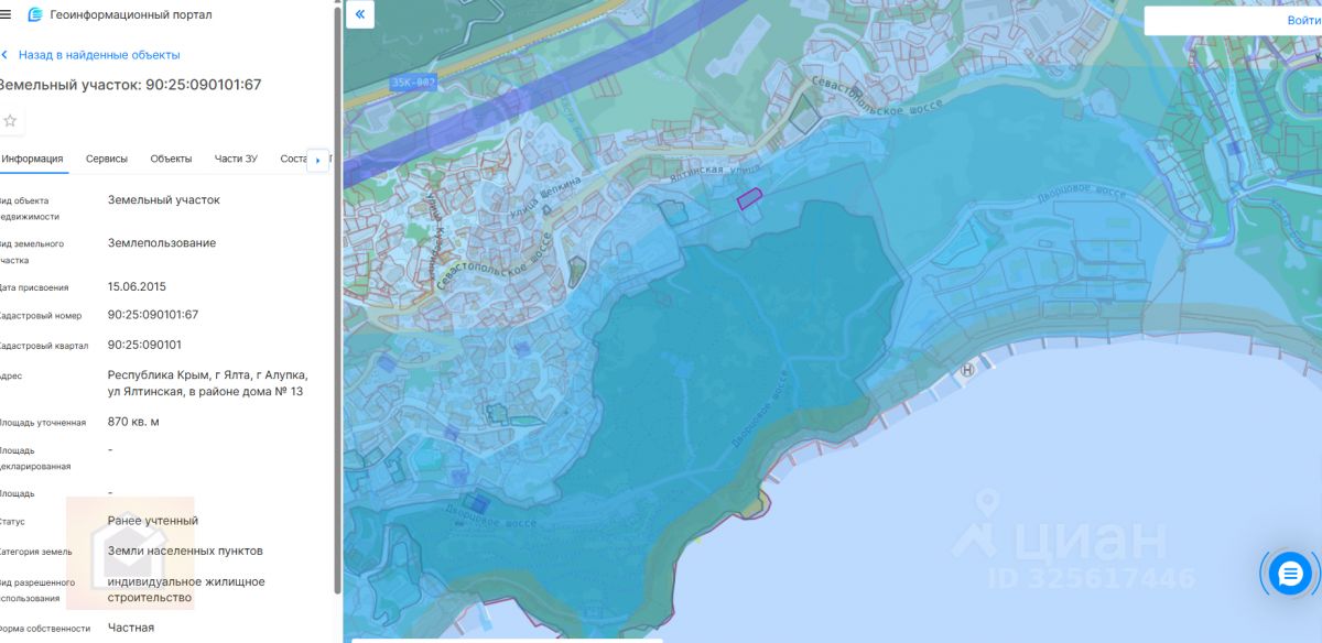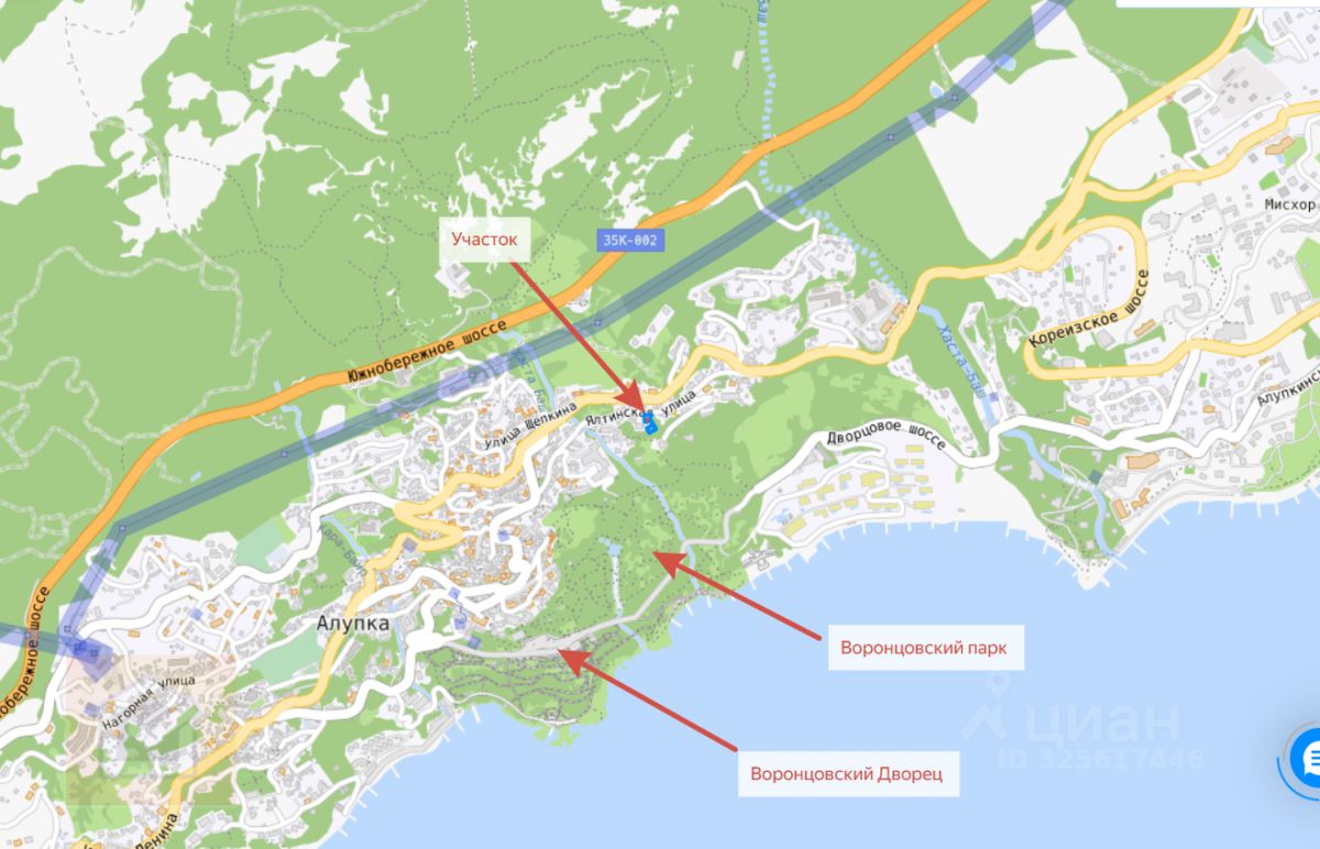 Адрес: Республика Крым, г. Ялта, г. Алупка, ул. Ялтинская, район дома 13. Этот участок расположен в исключительном месте, рядом с Воронцовским парком, пансионатом Алупка, что делает его идеальным выбором для строительства элитной недвижимости. На данный момент участок находится в аренде, а остальные уже выкуплены. Кадастровый номер 1й участка: 90:25:090101:155, 2й участок 90:25:090101:67 и 3й участок 90:25:090101:154.