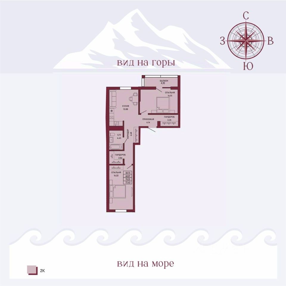 Продаётся 2-комнатная квартира в строящемся доме (Дом 1), срок сдачи: II-кв. 2028, общей площадью 70.25 кв.м., на 9 этаже. Новый жилой комплекс ''по ул. Мицко'' от застройщика ''Крым Море Град'' расположен по адресу: Республика Крым, г. Ялта, ул. Мицко