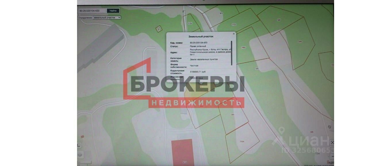 Объект 8222. Продам видовой земельный участок с роскошным видом на море и горы. (кадастровый 90:25:020104:420) в живописномрайоне Гаспра! Площадь: 10 соток ИЖС. Расположение: на склонах поселка Гаспра, с великолепным видом на море и Крымские горы. Описание участка: Расположен в живописной местности рядом с коттеджным поселком Гаспра Лайф. Уникальные виды на море, гору Ай-Петри и г. Кошка. К участку ведут две асфальтированные дороги: одна-из поселка Гаспра к нижней точке участка, другая — к межгородней трассе в верхней части. Участок расположен на склоне, что обеспечивает сохранение панорамных видов без закрытия соседними постройками. Коммуникации: - Электричество— по границе участка - Водопровод —доведен по улице в 100 м от участка - Газ — на расстоянии 100 м Инфраструктура и транспорт: Расстояние до центра Ялты — всего 10 км До пляжа —около 15 минут на автомобиле В пятиминутах езды — школа, детский сад и магазины, что обеспечивает комфортное проживание. Документы: Проверены юристами и готовы к сделке. В наличии ГПЗУ и разрешение (уведомление) на строительство. Профессиональное сопровождение сделки до получения прав собственности. Не упустите возможность стать владельцем этого уникального участка в живописном уголке ЮБК! Позвоните сейчас для получения дополнительной информации и организации просмотра!